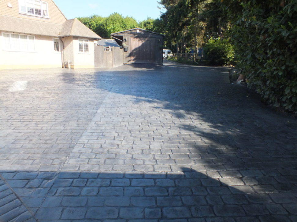 This 800 square metre driveway and parking area was finished in platinum grey and charcoal. The chosen design is Cheshire cobble.